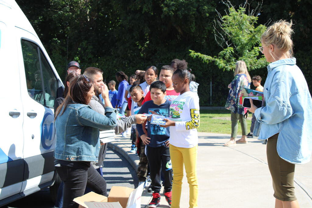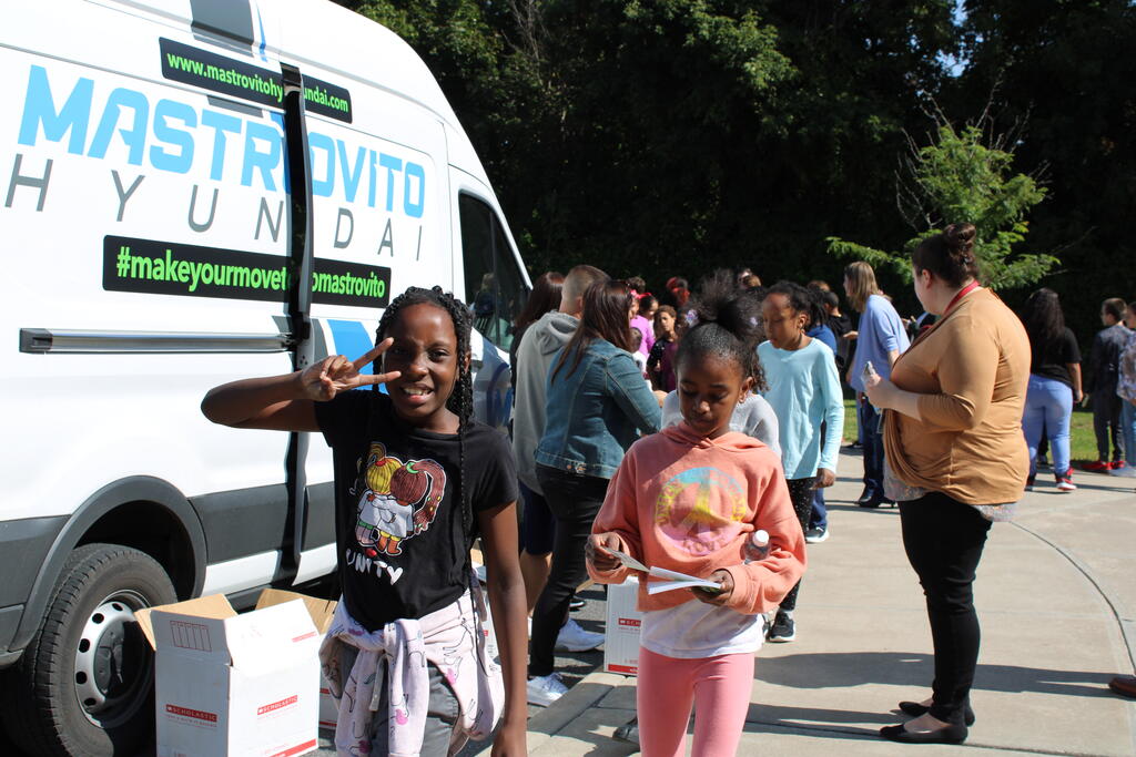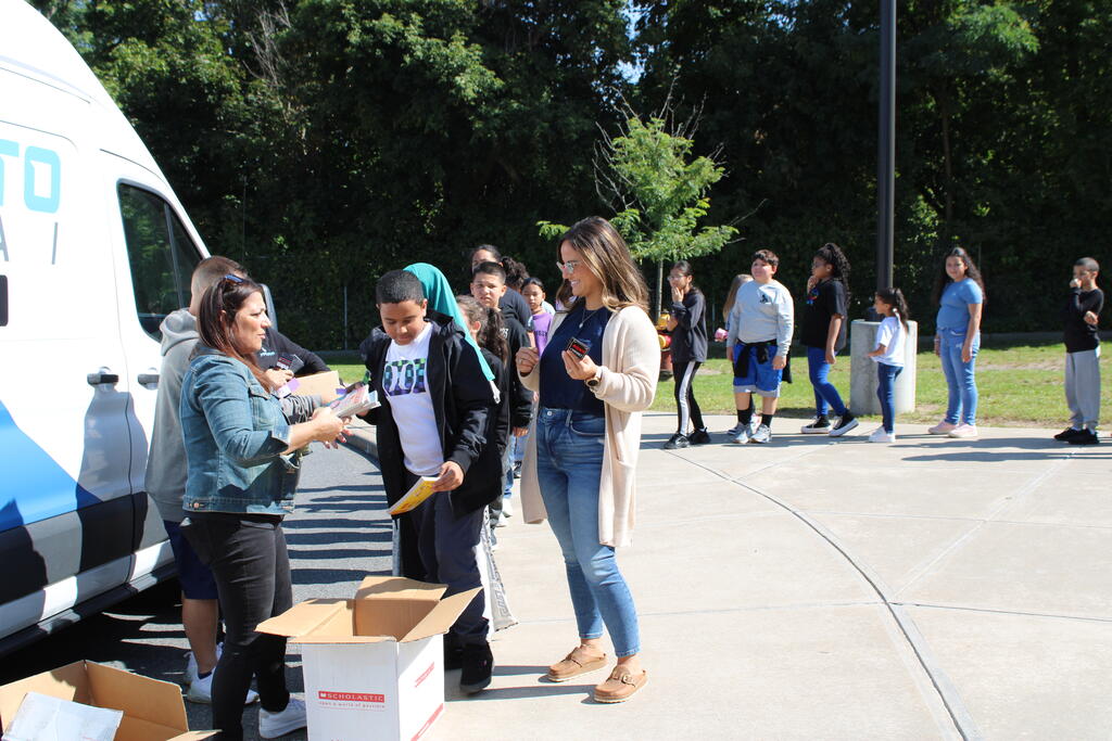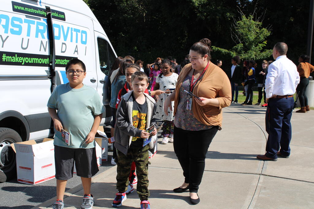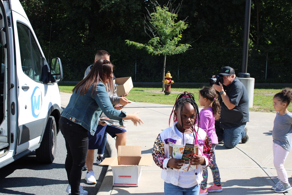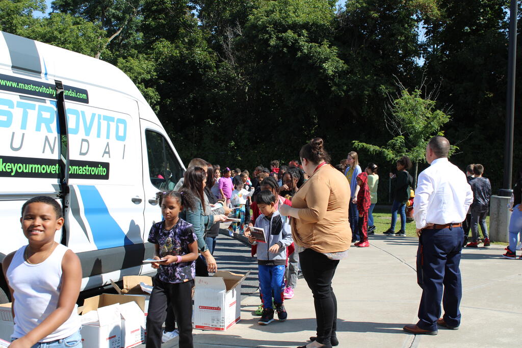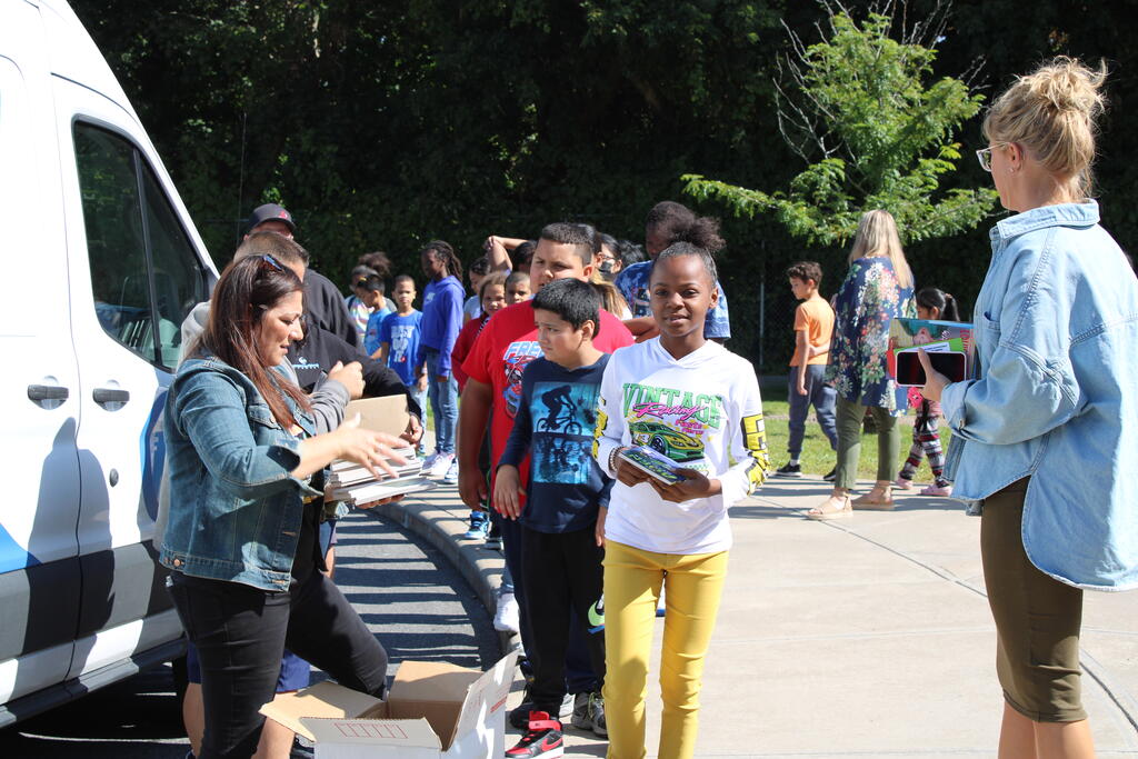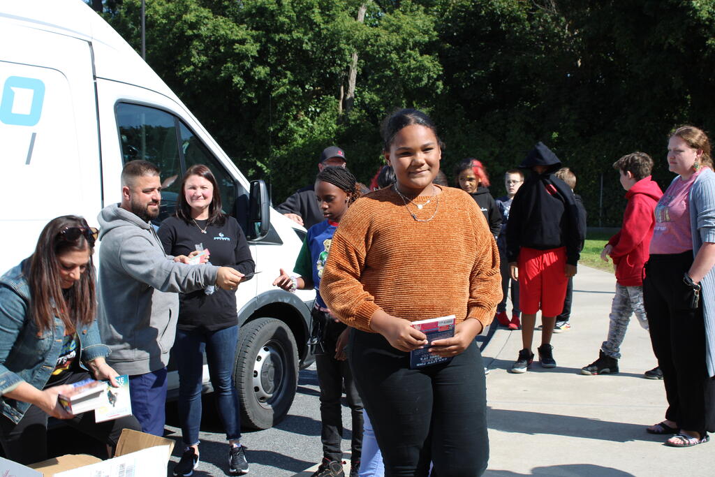 စက်တင်ဘာလ ၂၁ ရက် ကြာသပတေးနေ့မှာ Mastrovito Hyundai Bookmobile ကရင်နန်ကျောင်းကို လည်ပတ်ခဲ့တယ်! အဆောက်အအုံထဲက ကျောင်းသားတိုင်း စာအုပ်တစ်အုပ် လက်ခံရရှိခဲ့ကြတယ်။