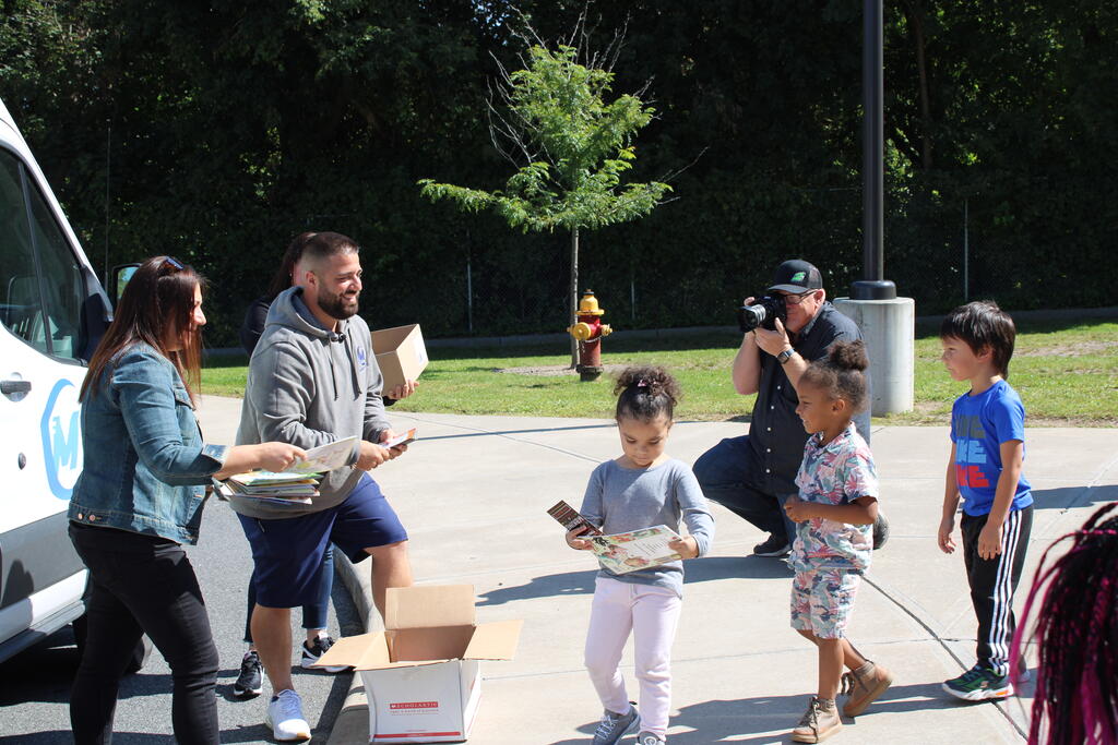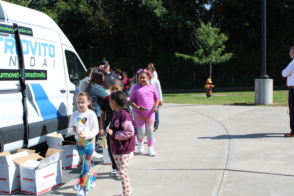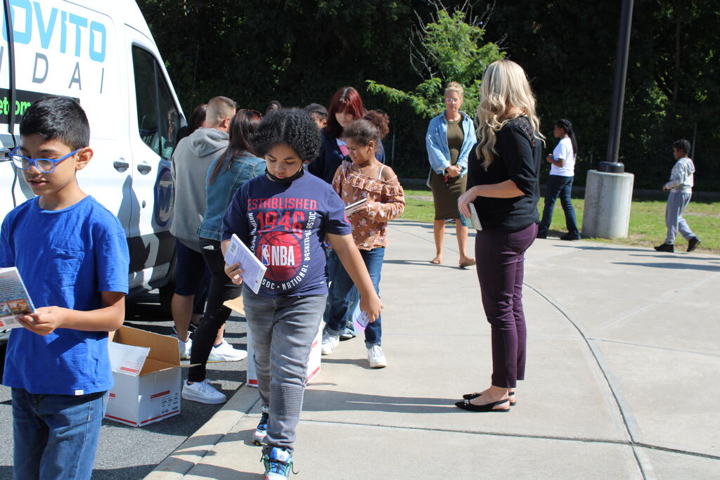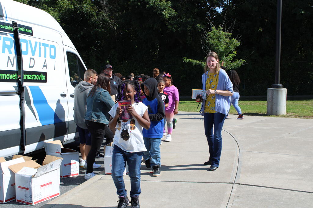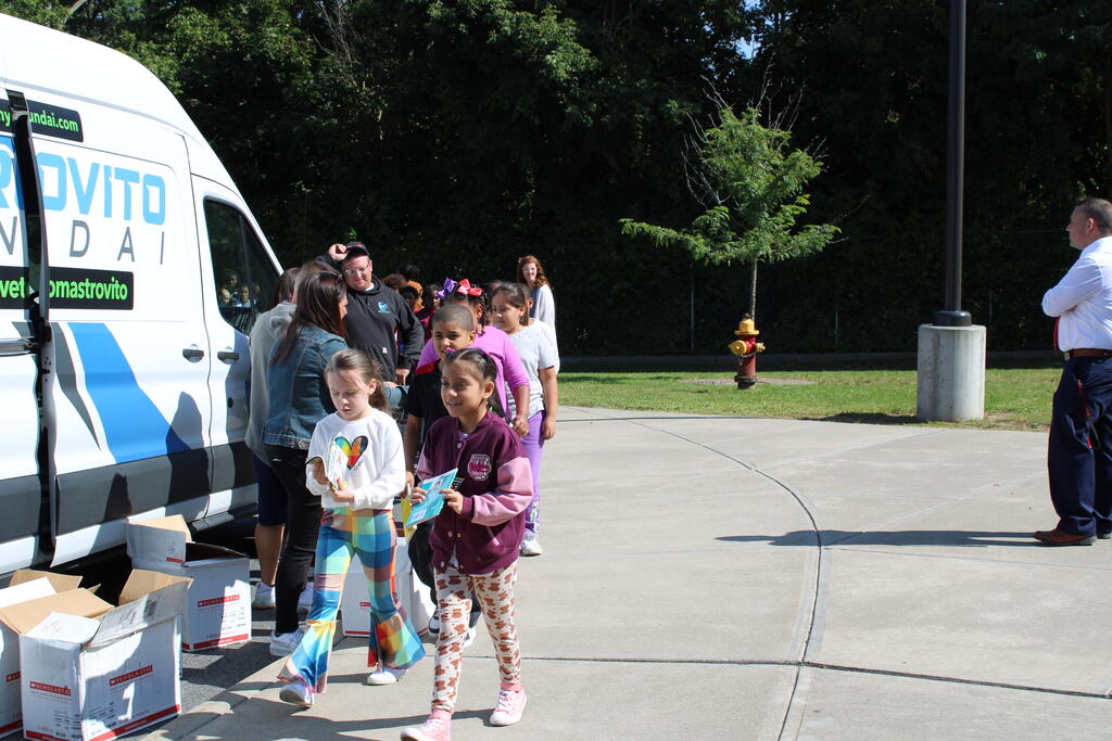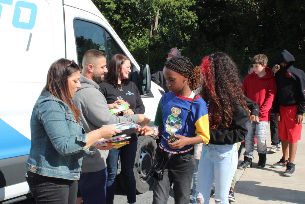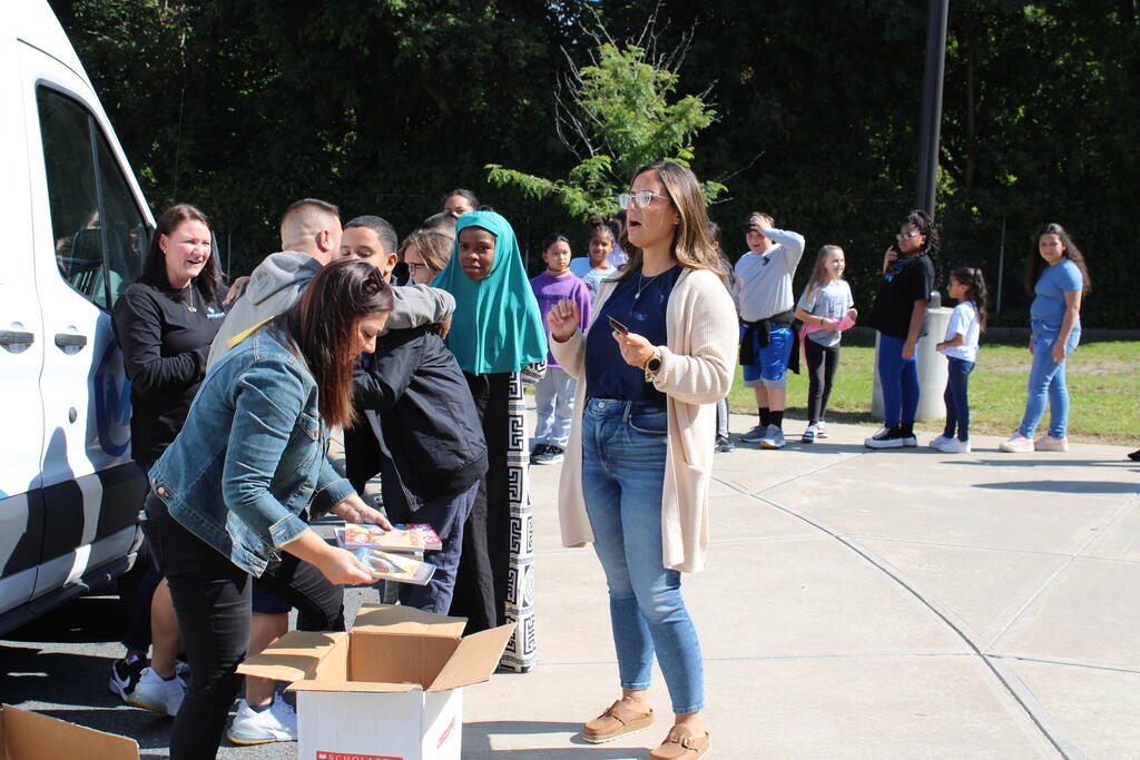 စက်တင်ဘာလ ၂၁ ရက် ကြာသပတေးနေ့မှာ Mastrovito Hyundai Bookmobile ကရင်နန်ကျောင်းကို လည်ပတ်ခဲ့တယ်! အဆောက်အအုံထဲက ကျောင်းသားတိုင်း စာအုပ်တစ်အုပ် လက်ခံရရှိခဲ့ကြတယ်။