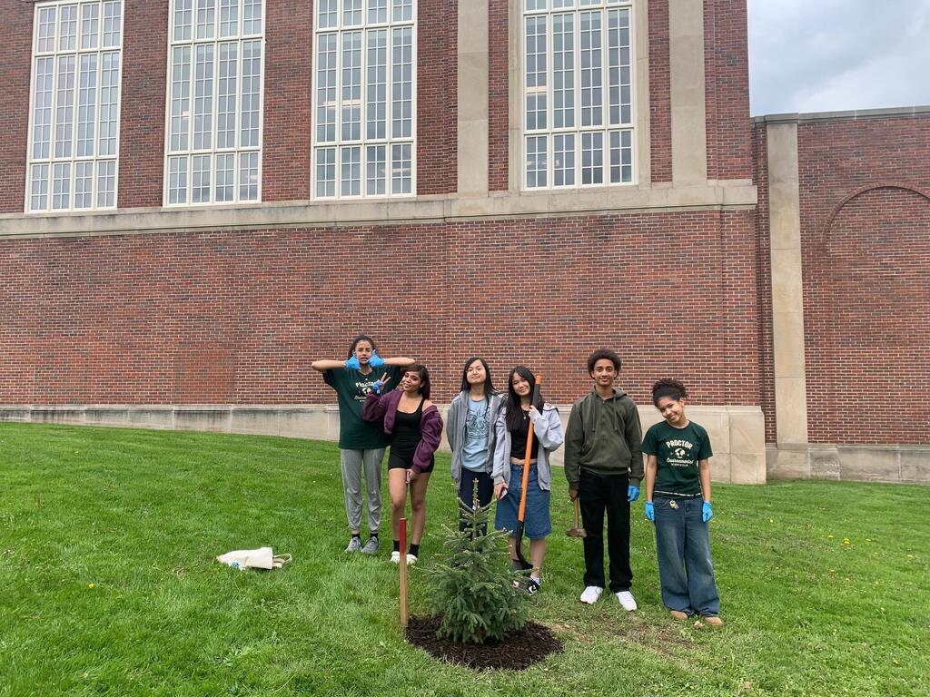အင်္ဂါနေ့၊ မေလ 13 ရက်နေ့တွင်၊ Proctor အထက်တန်းကျောင်း Environmental Science Club သည် ကျောင်းရှေ့တွင် ကျူလစ်ပင်တစ်ပင်နှင့် အနက်ရောင် spruce ကို စိုက်ပျိုးခြင်းဖြင့် ကမ္ဘာမြေသို့ ပြန်လည်ပေးအပ်ခြင်း၏ နှစ်စဉ်အစဉ်အလာကို ဆက်လက်လုပ်ဆောင်ခဲ့သည်။ ဤထပ်တိုးမှုအသစ်များသည် လွန်ခဲ့သည့်သုံးနှစ်အတွင်း ကလပ်အသင်းအား ပြုစုပျိုးထောင်ပေးခဲ့သော ကြီးထွားလာသောသစ်ပင်ပေါ်တွင် တည်ဆောက်ထားသည်။